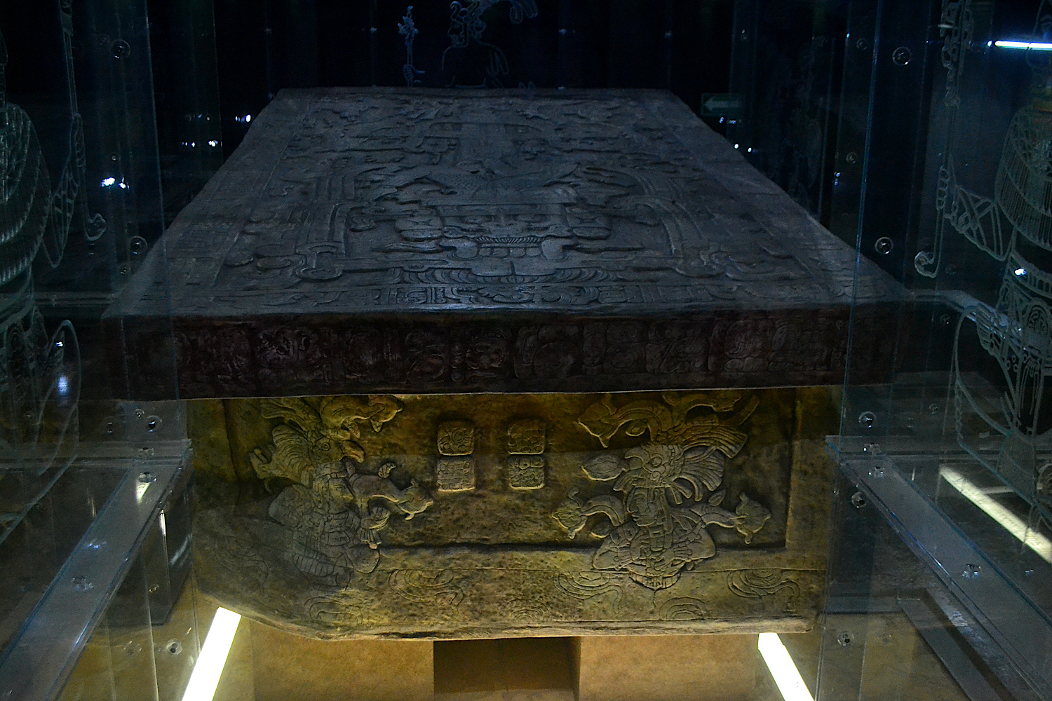巴加尔石棺,位于遗址的博物馆内 ,该石棺顶部图案中类似于宇宙飞船的图案也曾经令许多人惊讶不已。(许多人以此为依据相信玛雅人拥有飞行器,或者是与外星人有着某种联系,不过一般严肃的历史学家仍然认为那只是个普通的神话图案