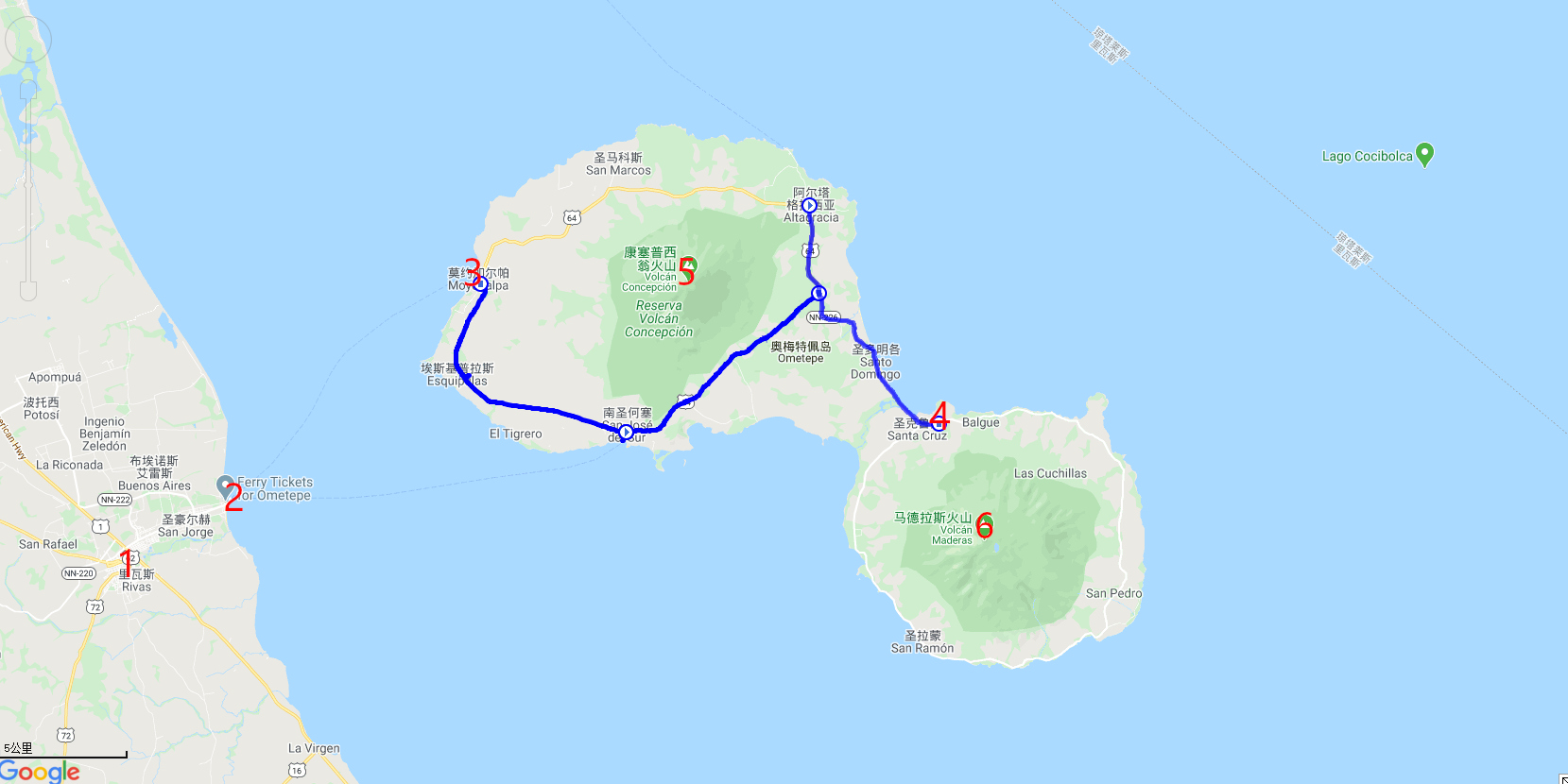 蓝色线条为从moyogalpa码头乘坐公交车,到santa cruz实际走过的路线(公交车从moyogalpa经过机场,san jose del sur, altagracia, 再到santa cruz),公交车在concepcion volcan火山岛只走岛南的路线.
