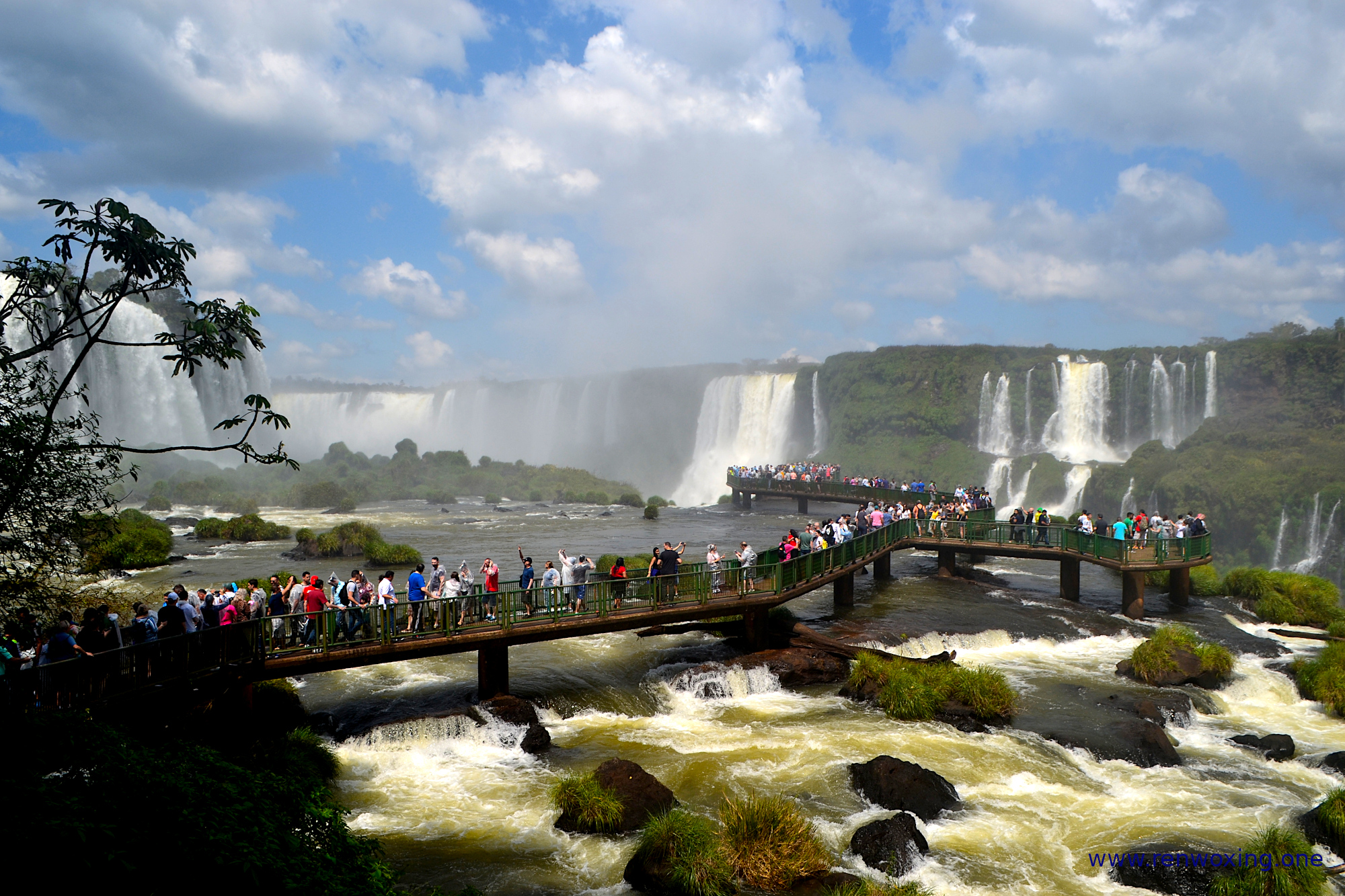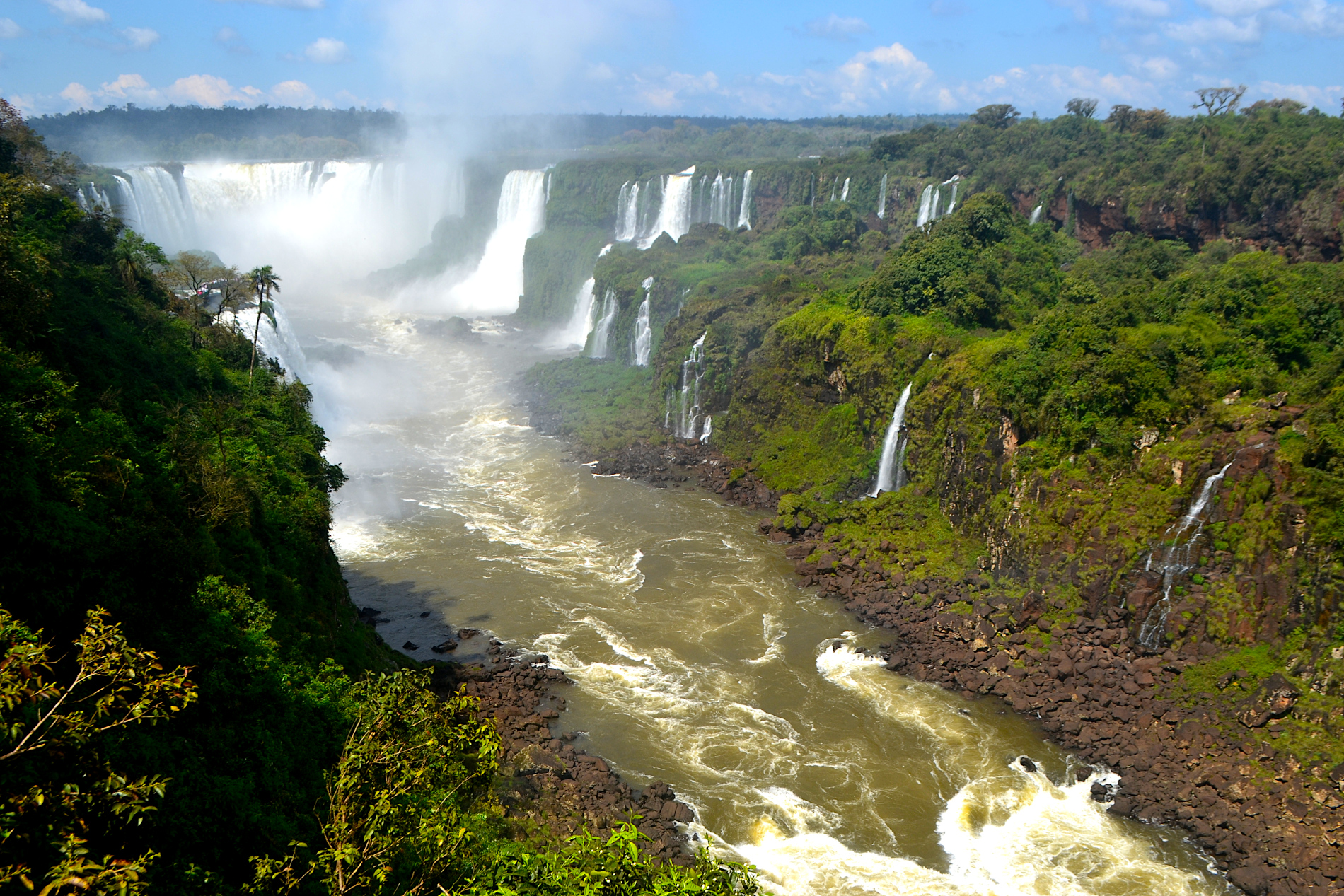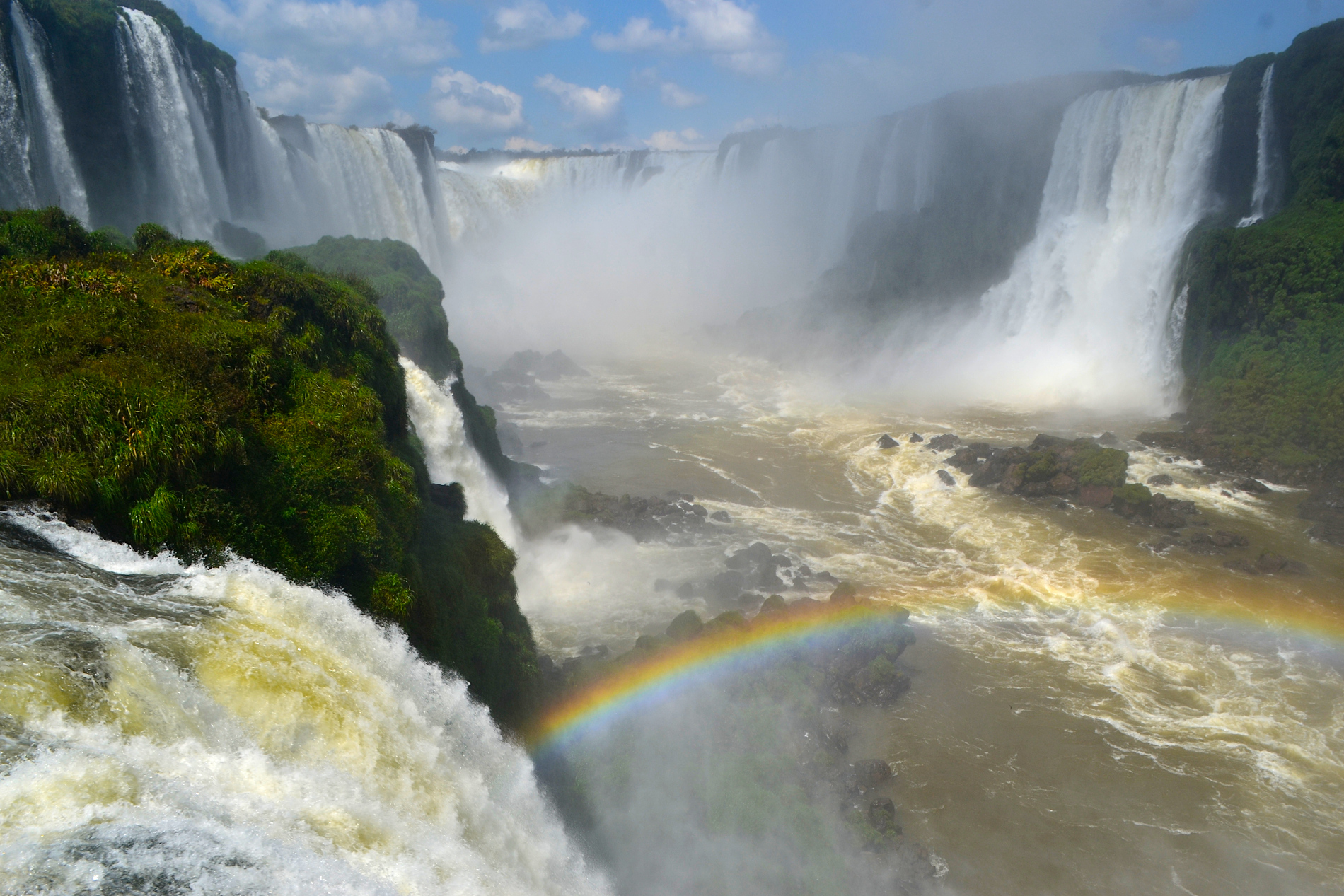 伊瓜苏瀑布,东非维多利亚瀑布,及美加的尼加拉瀑布,是世界三大瀑布。伊瓜苏瀑布实为一组瀑布群,由275股大小瀑布或急流组成,总宽度2.7公里,比尼亚加拉瀑布宽4倍,落差由平均60米至最高82米。年均流量1,750立方米/秒,雨季时瀑布最大流量为12,750立方米/秒,这时大小飞瀑也汇合成一个马蹄形大瀑布。