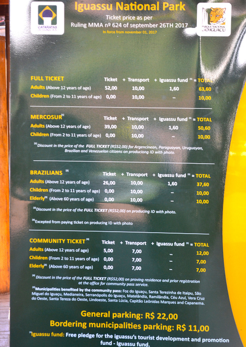 iguacu瀑布门票价目表,买票处在距离瀑布10公里的国家公园的门口处,公交车将会在此停车。买完票后,转坐着公园内的公交车再继续往前走,到达瀑布观察处。国际公民价格 63.6巴西币。