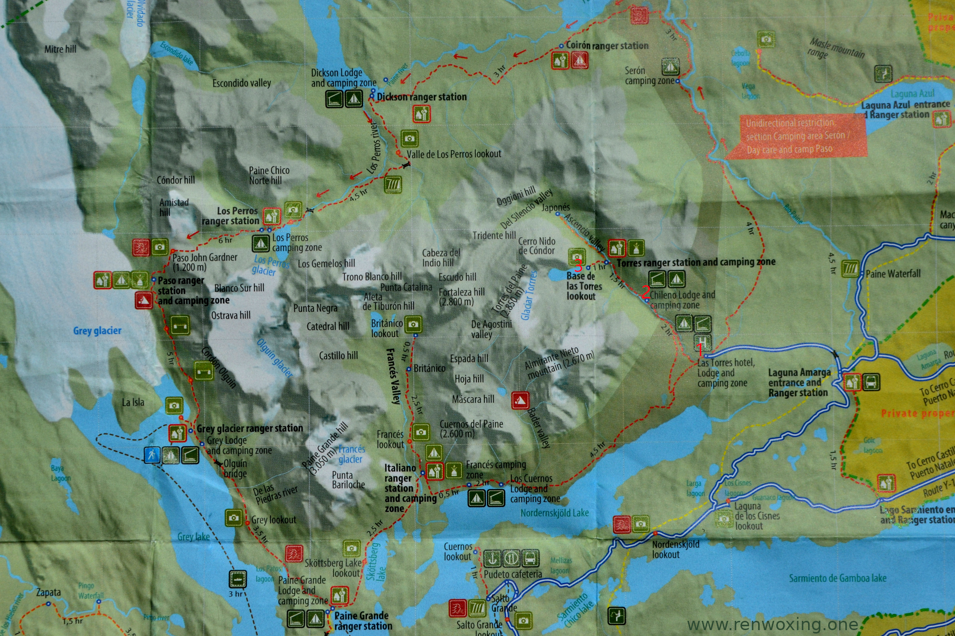 包括 公园的招牌景点Mirador Las Torres(三塔),Valle Frances(法国谷), Lago Grey(Grey lake)等。走W线时,常从西面,即是在中心营地或hotel las torres附近开始,走到三塔,再折回来到法国谷,再折回来走到Grey lake.