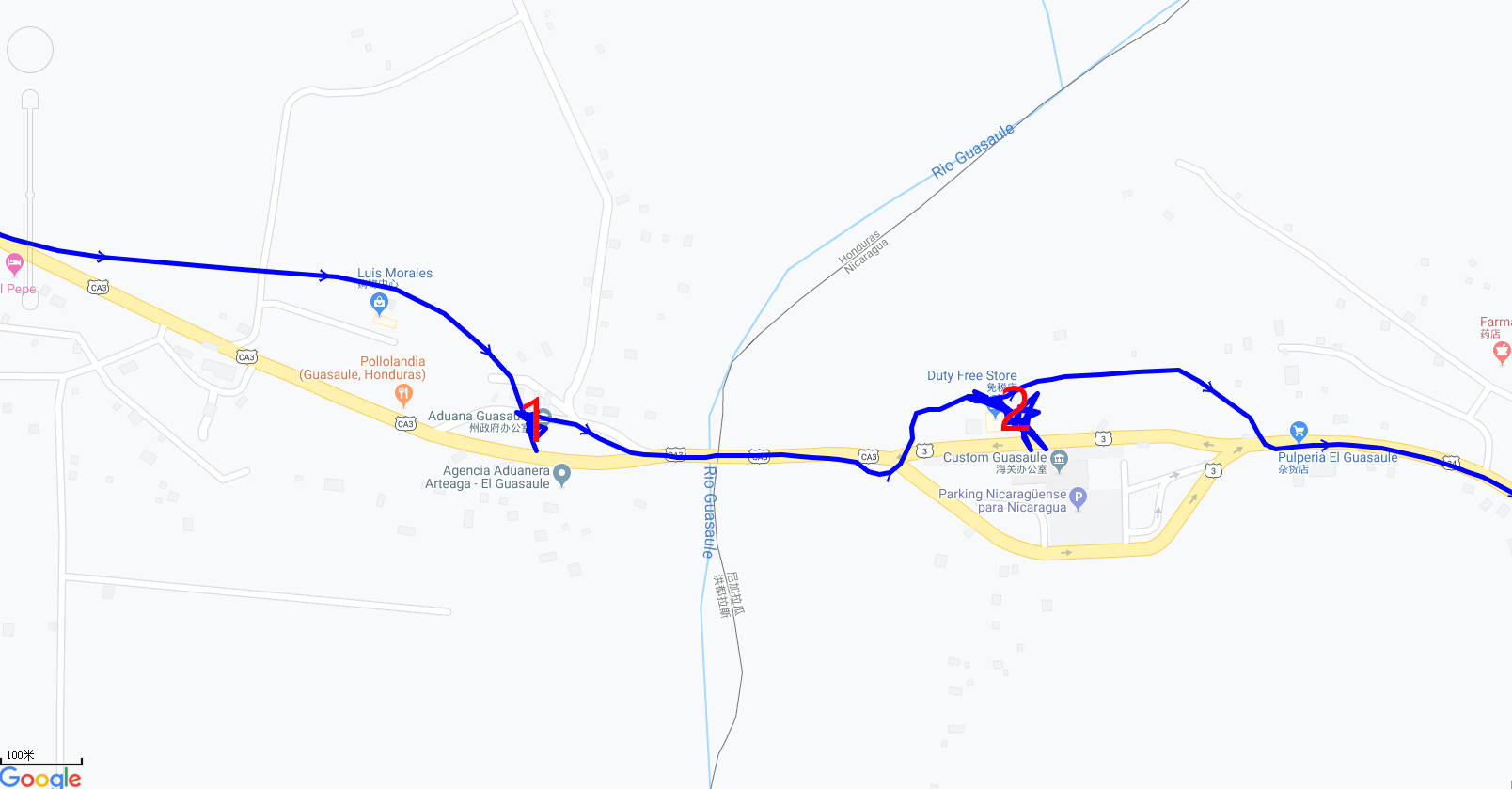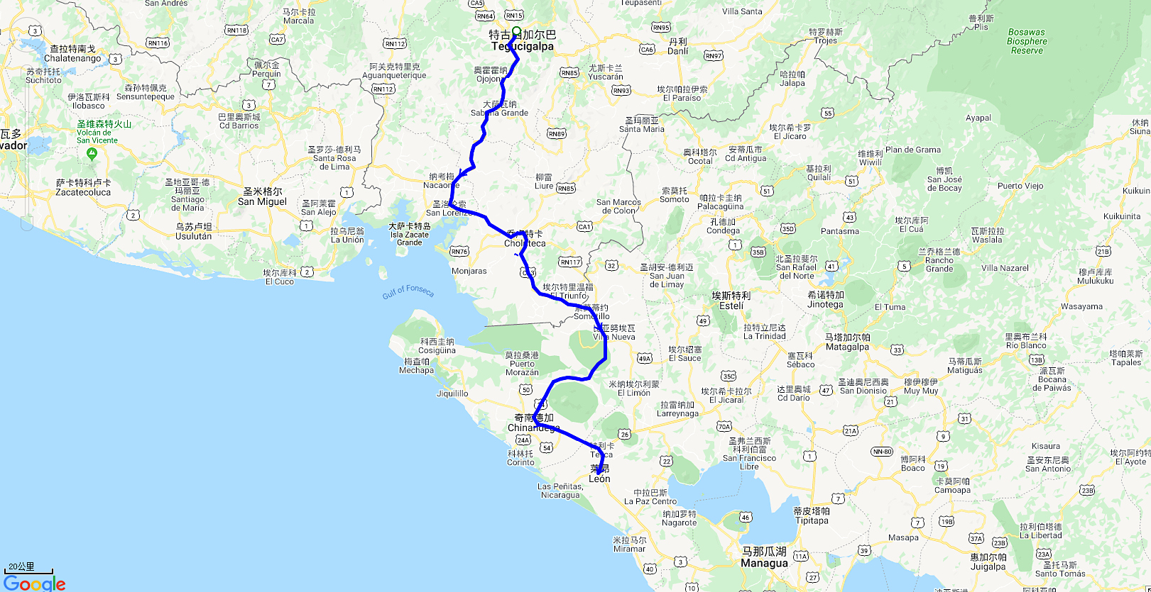 上图为从洪都拉斯首都陆路过境到尼加拉瓜莱昂Leon,所记录的GPS轨迹