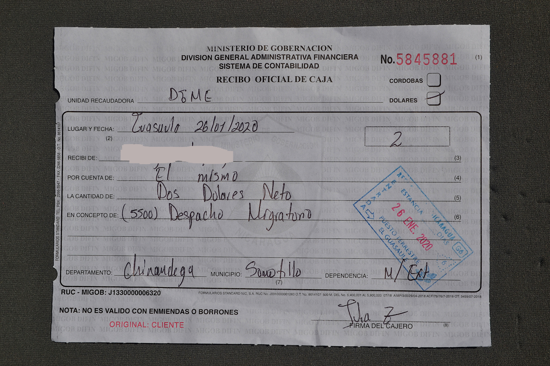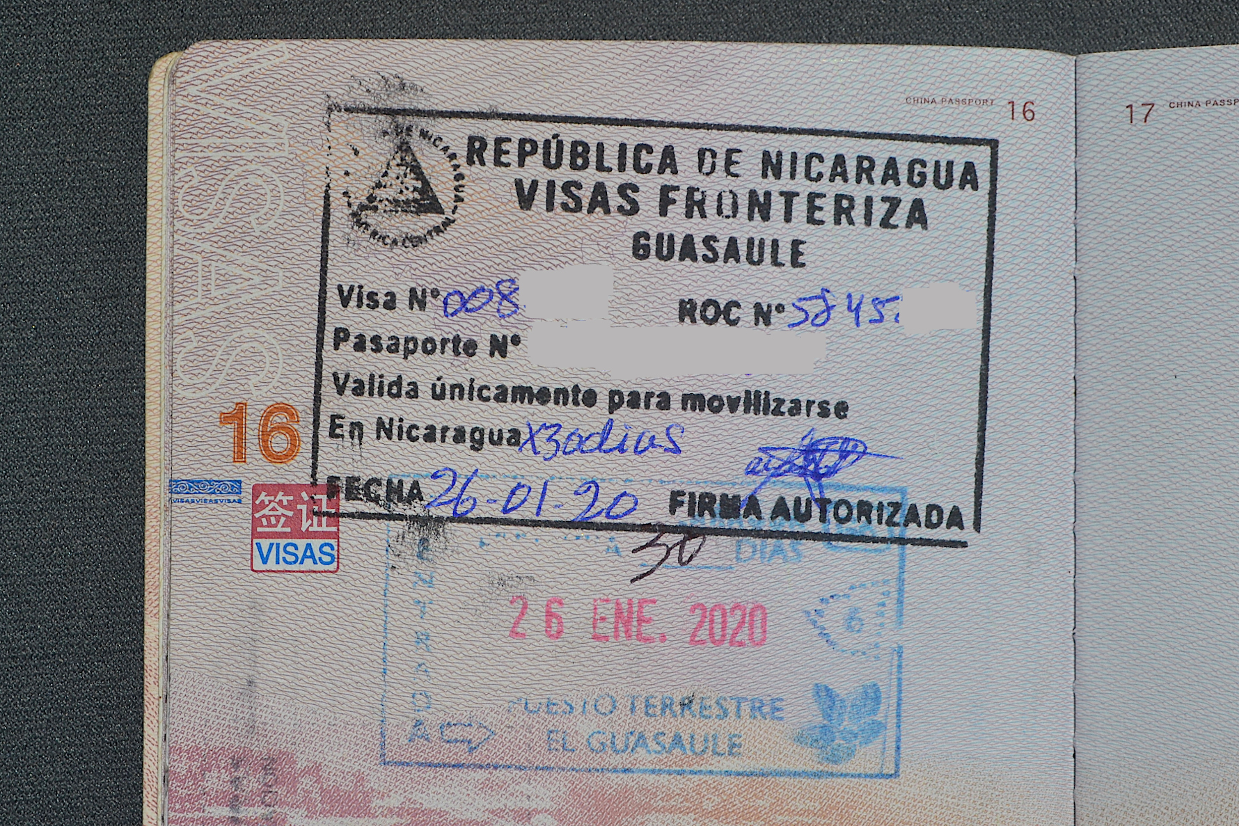 到了尼加拉瓜入境时,车上的服务员让我在傍边等着,他自己就开始帮忙跑单了,看着他不断地往各个办公室跑,去找相关的海关官员,并跑到外面去把护照上的某些页复印了,再拿回海关办公室处。
