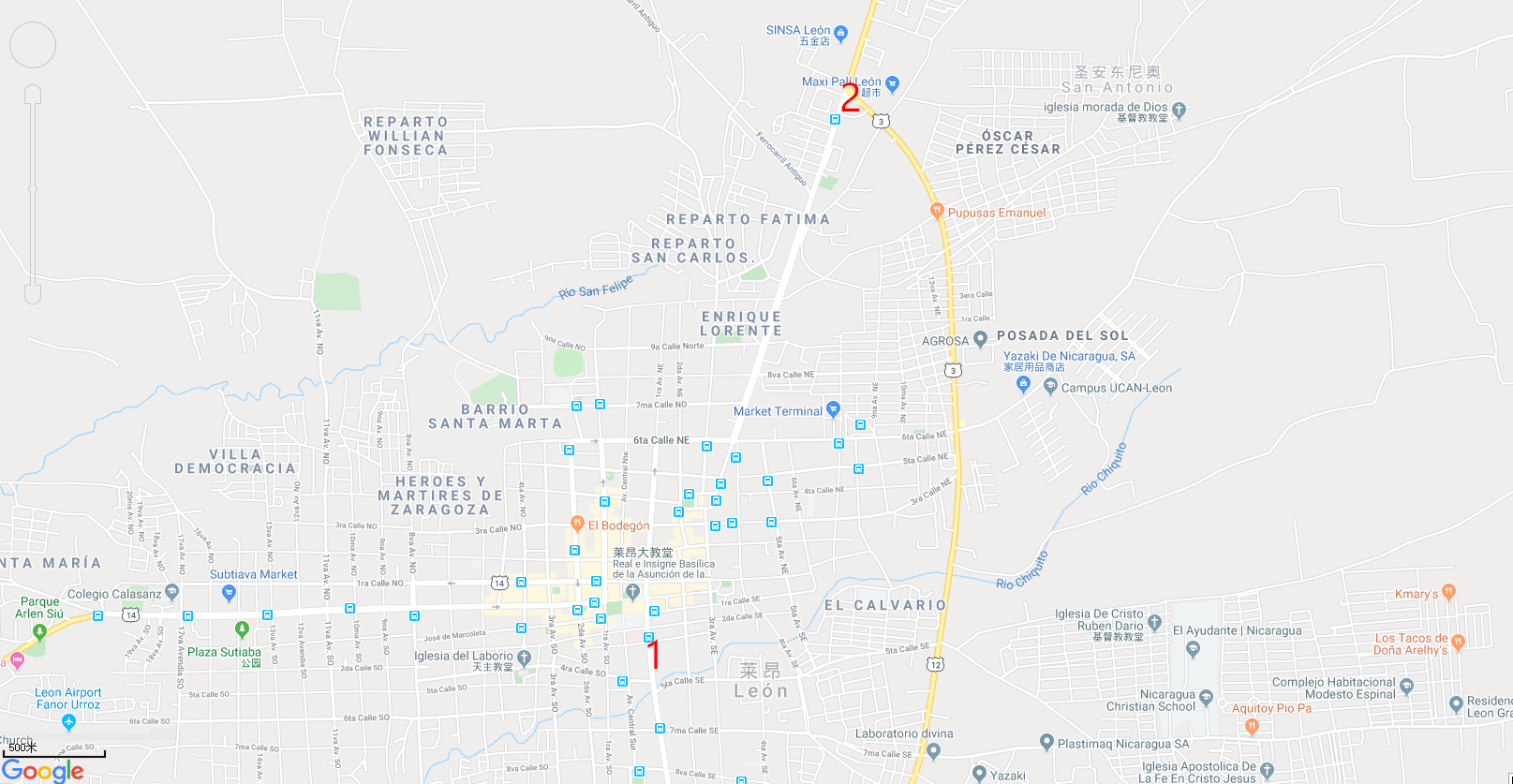 2 tica bus在Leon的下客点(从洪都拉斯tigucigalpa到尼加拉瓜的马那瓜的tica bus,途径Leon时,不会入城的,在城北大约3公里的路口就让下来了,打车到市区中心要每人30尼加拉瓜币,或给1美金,出租车按人头收费的)。
