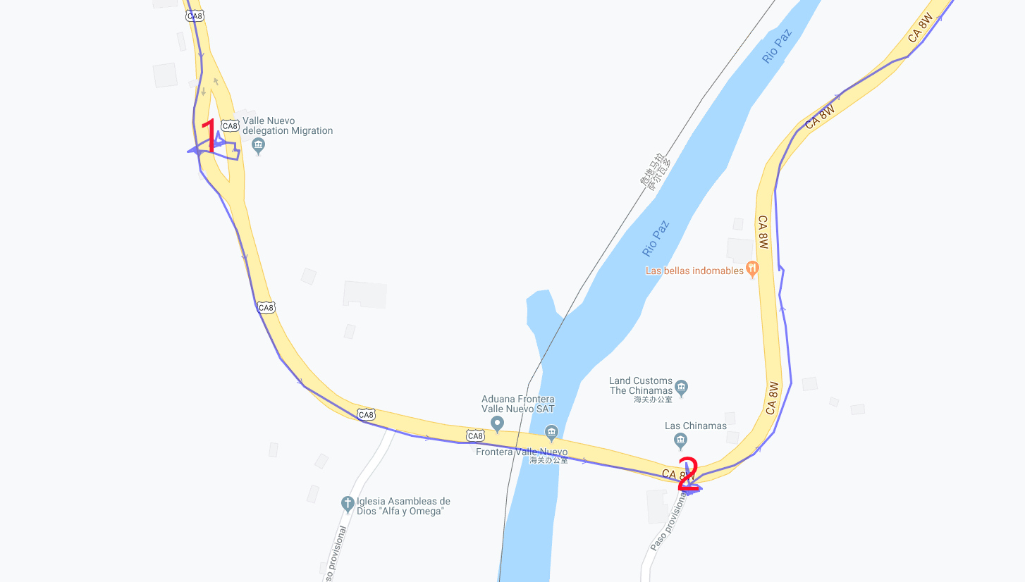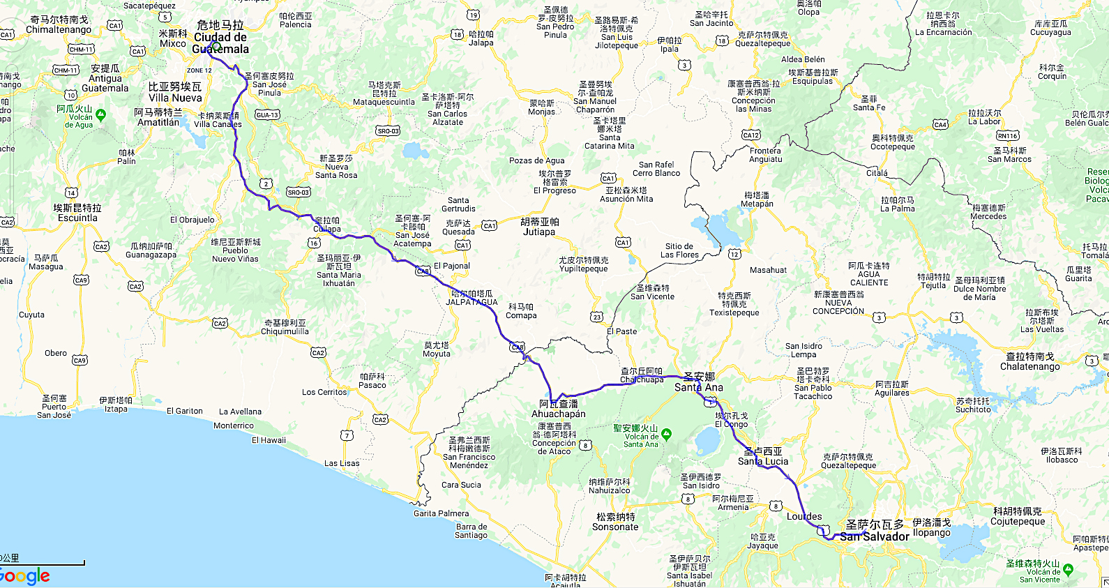从危地马拉城到萨尔瓦多记录的GPS轨迹,全程250公里,耗时6.5小时