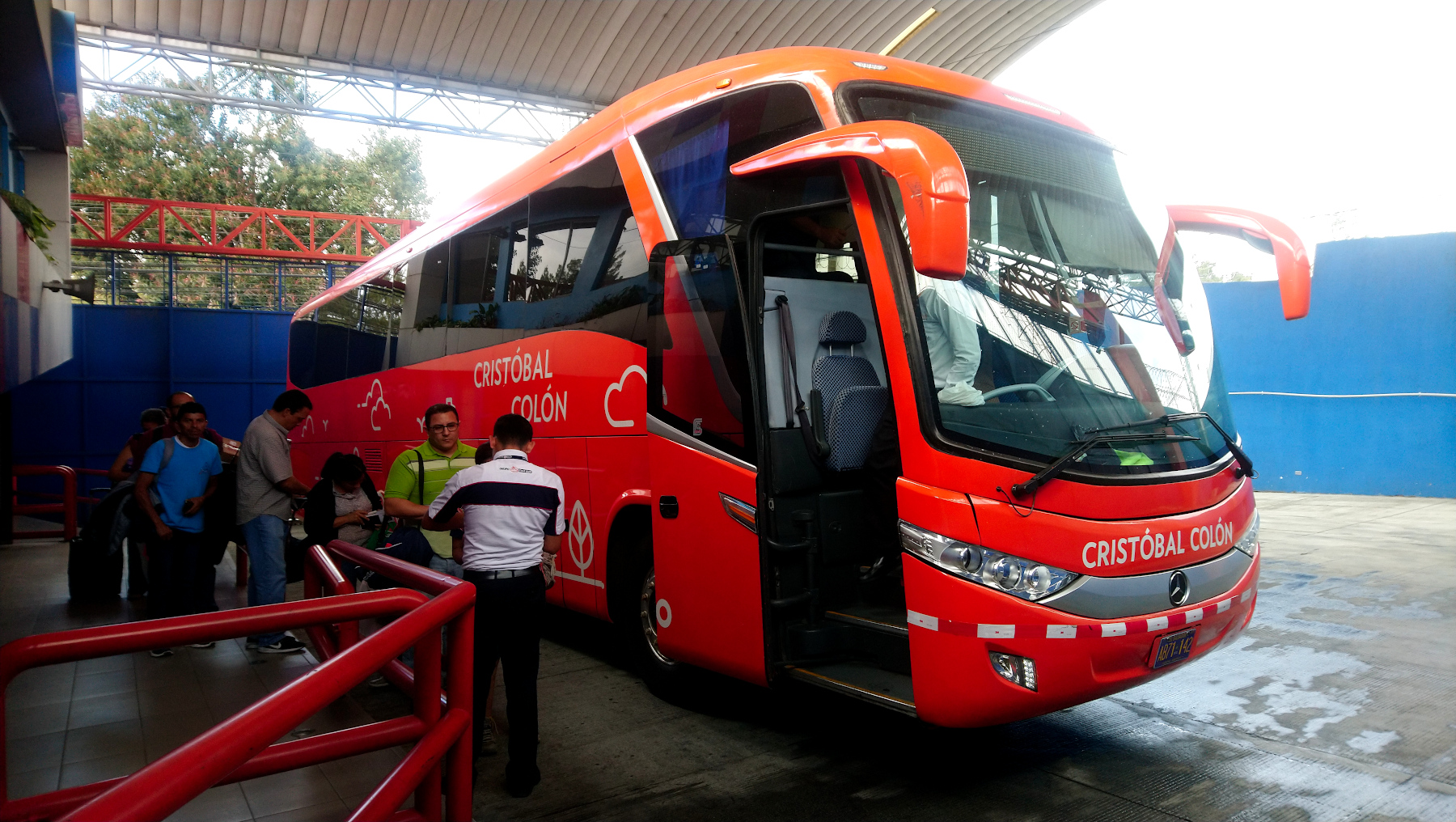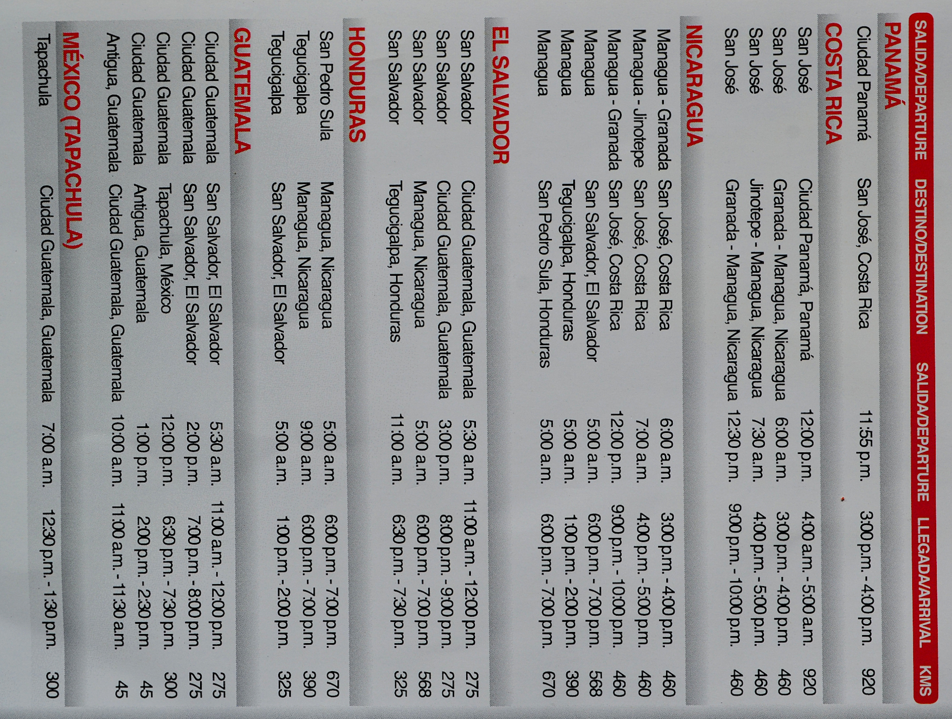 在危地马拉城,问旅馆的前台,知道tica bus大巴公司,有车从危地马拉城直接开到萨尔瓦多,于是提前一天跑到tica bus大巴公司去询问,果然有车从危地马拉城到萨尔瓦多,每天2班(出发时间为5:00AM,和 14:00PM),票价180危币,行程6.5小时.