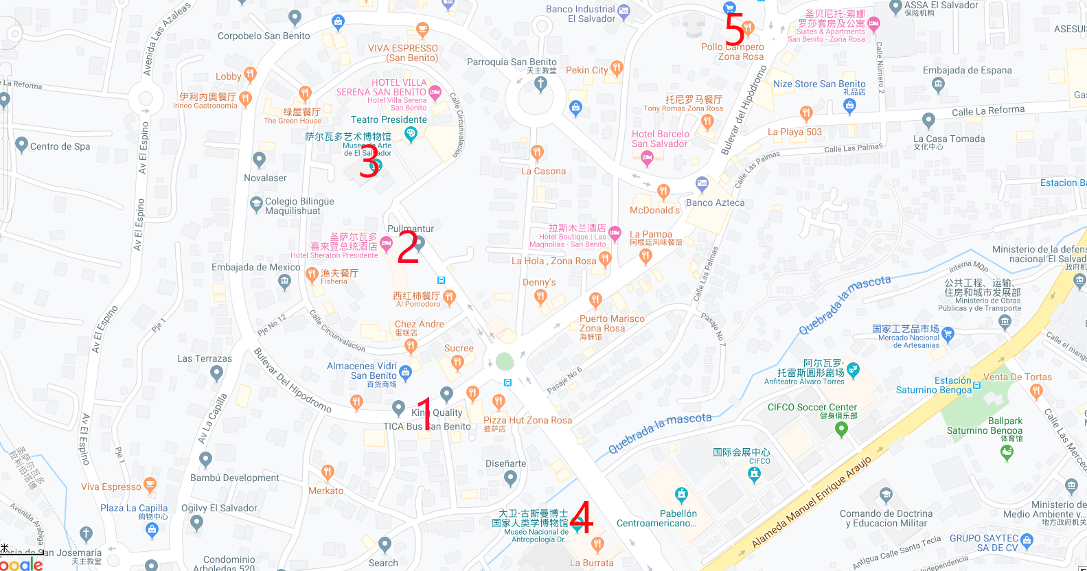 并且在网上查到,tica bus在萨尔瓦多有2个停靠点, tica Bus San Benito(在新城区)和Tica Bus San Carlos(在旧城区),这2个停靠点相距大约7公里,于是当天晚上就预定了在萨尔瓦多的住宿,由于知道汽车是在晚上才到萨尔瓦多,所以找旅馆时,尽量找离车站近的,于是就预定了zona hostel (就在Tica Bus San Benito对面,相隔一条马路)。