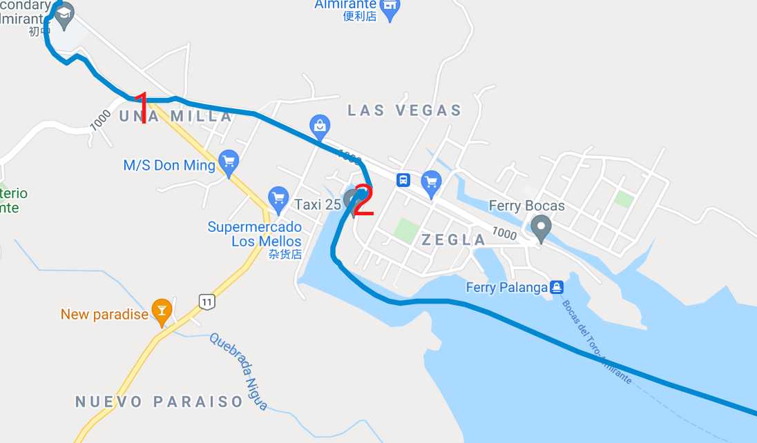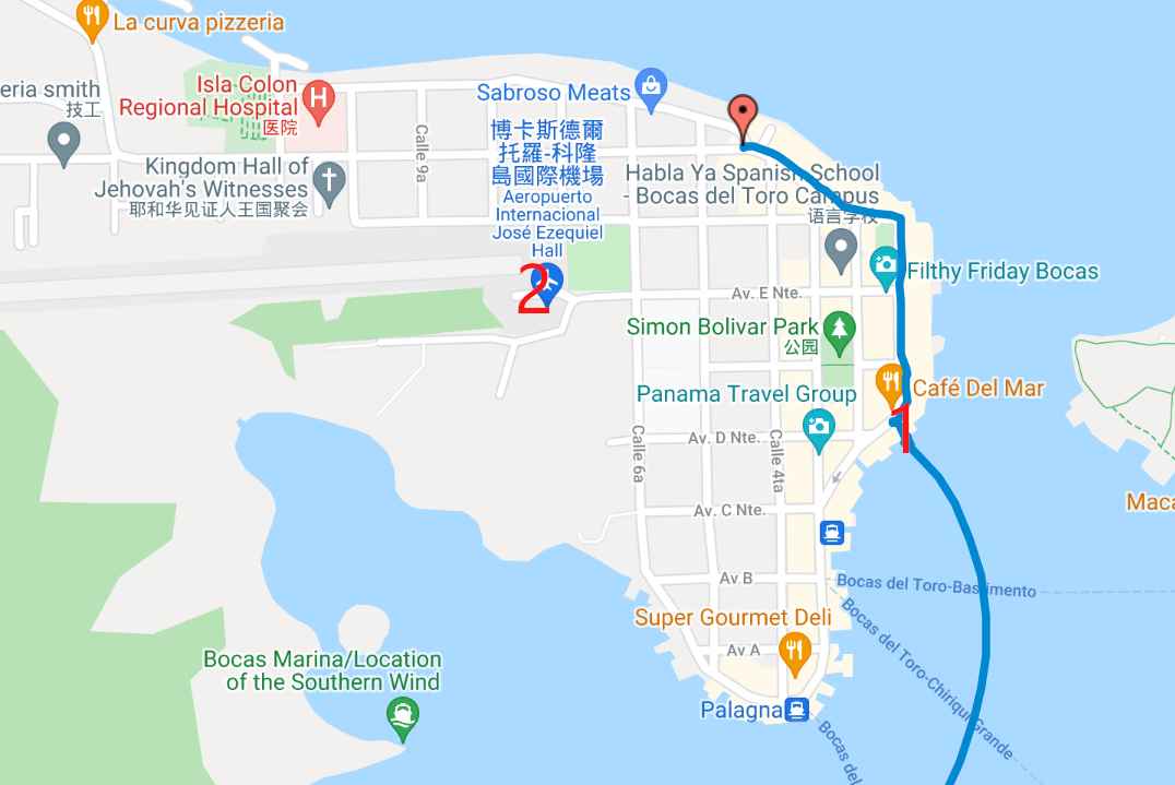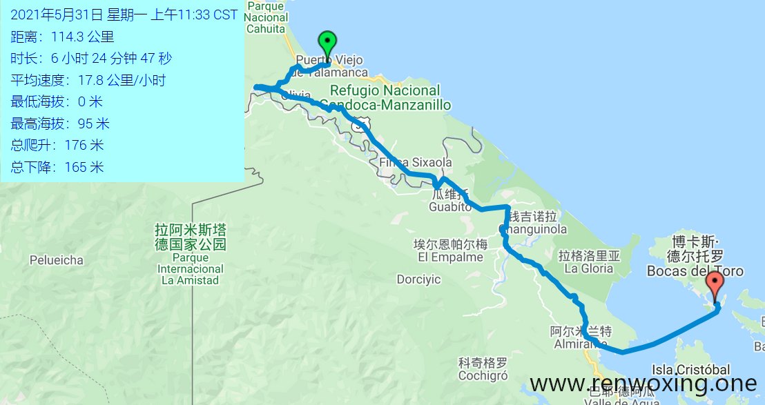 从哥斯达黎加的Puerto viejo 到巴拿马的Bocas del toro 岛, 总体行程114公里,耗时6小时24分钟。