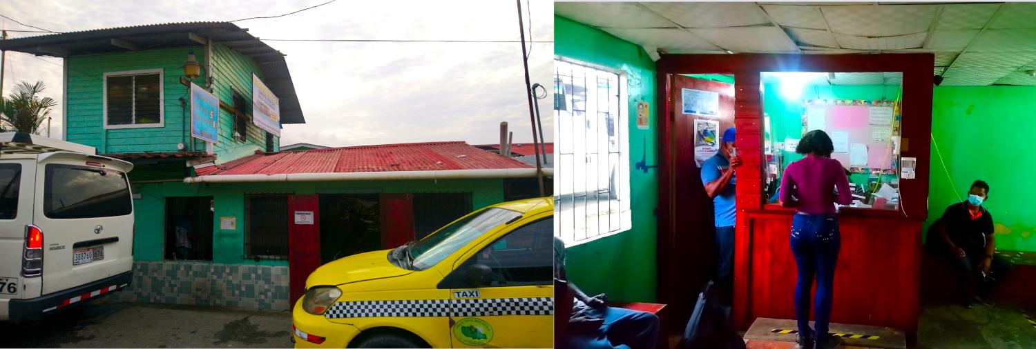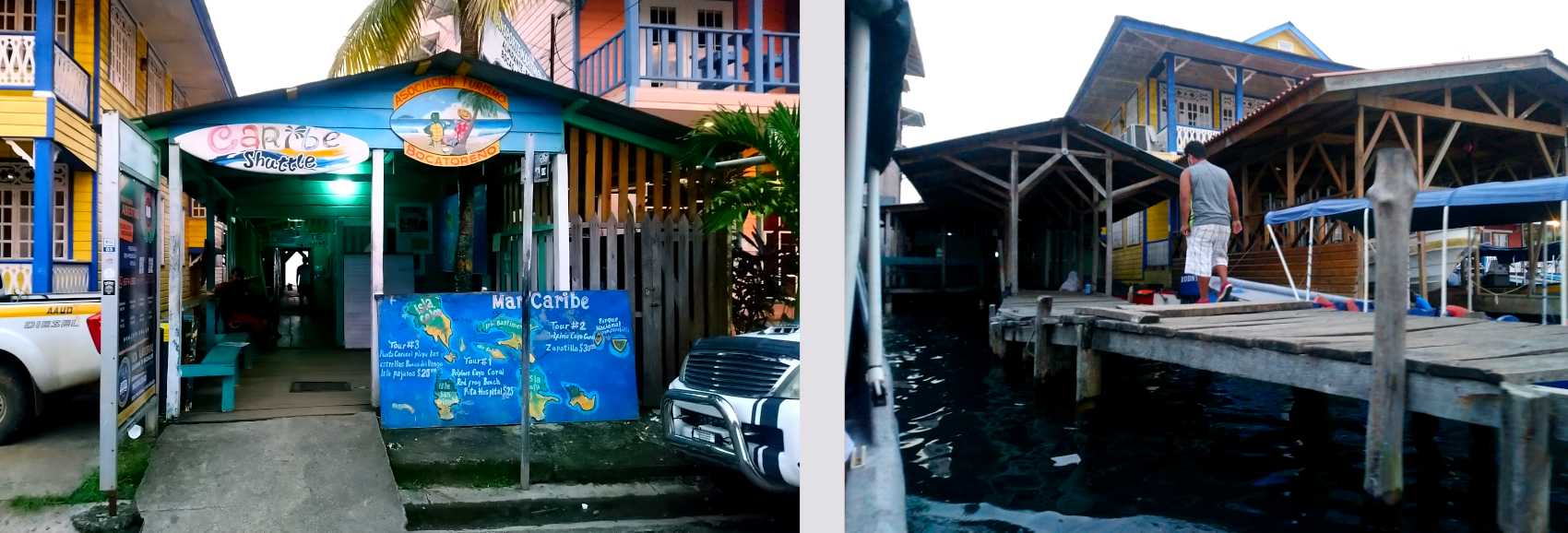Maritimo Valencia船公司在Bocas del Toro岛上的卖票处(左),及其上下客的码头(右)。