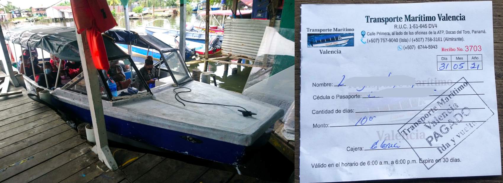 Maritimo Valencia船公司的船和船票,船票单程6美金,双程10美金,有效期30天,从早上6:00AM—6:00PM均有船。从陆上almirante到岛上Bocas del Toro,单程耗时30分钟。