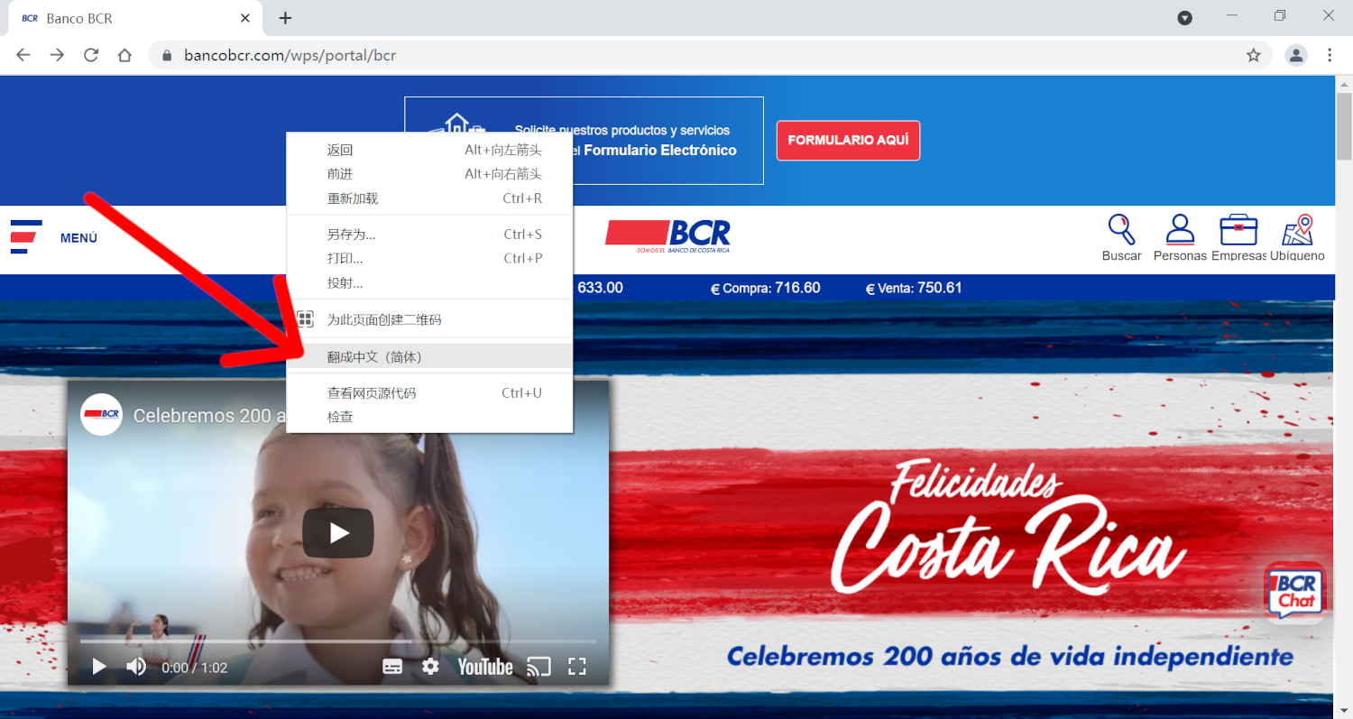 2. 在BCR网页上的空白处,点击鼠标右键,把网页翻译成能看懂的中文。
