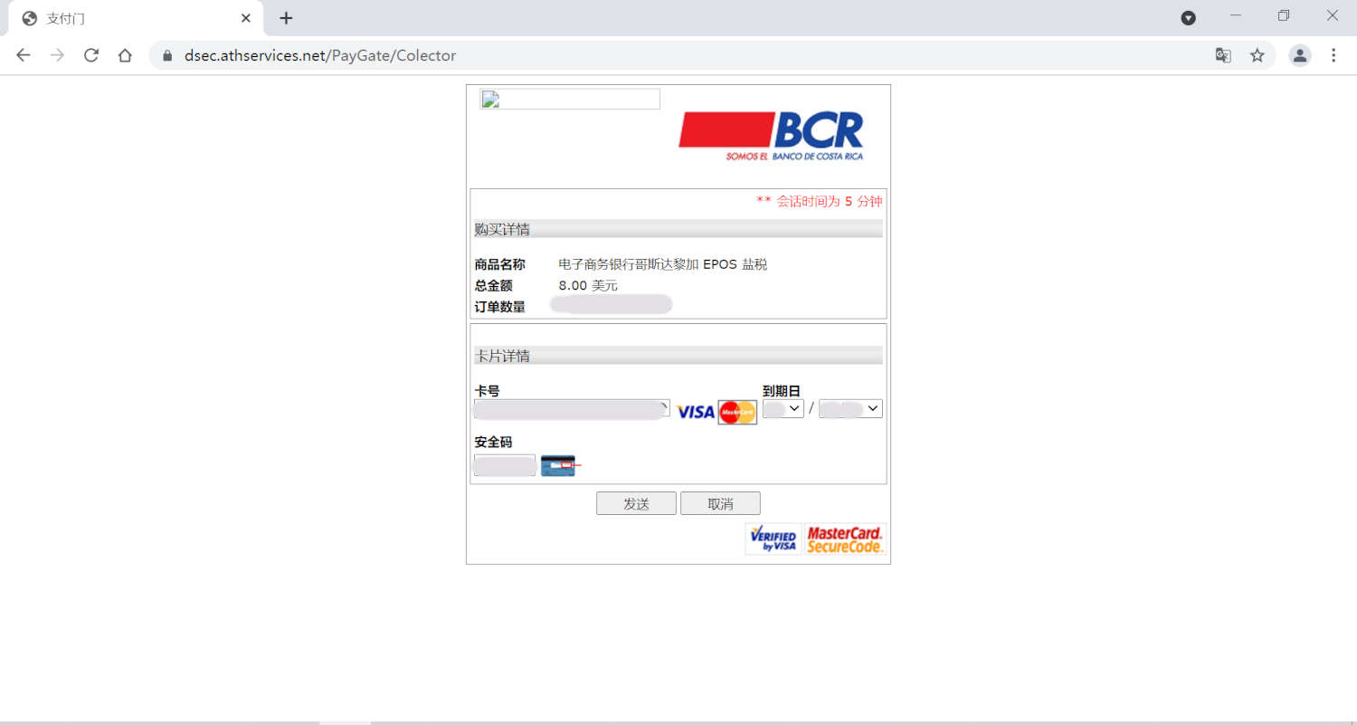 8.在此页面中,填入自己信用卡的卡号,到期日,及安全码后,点击“发送”。