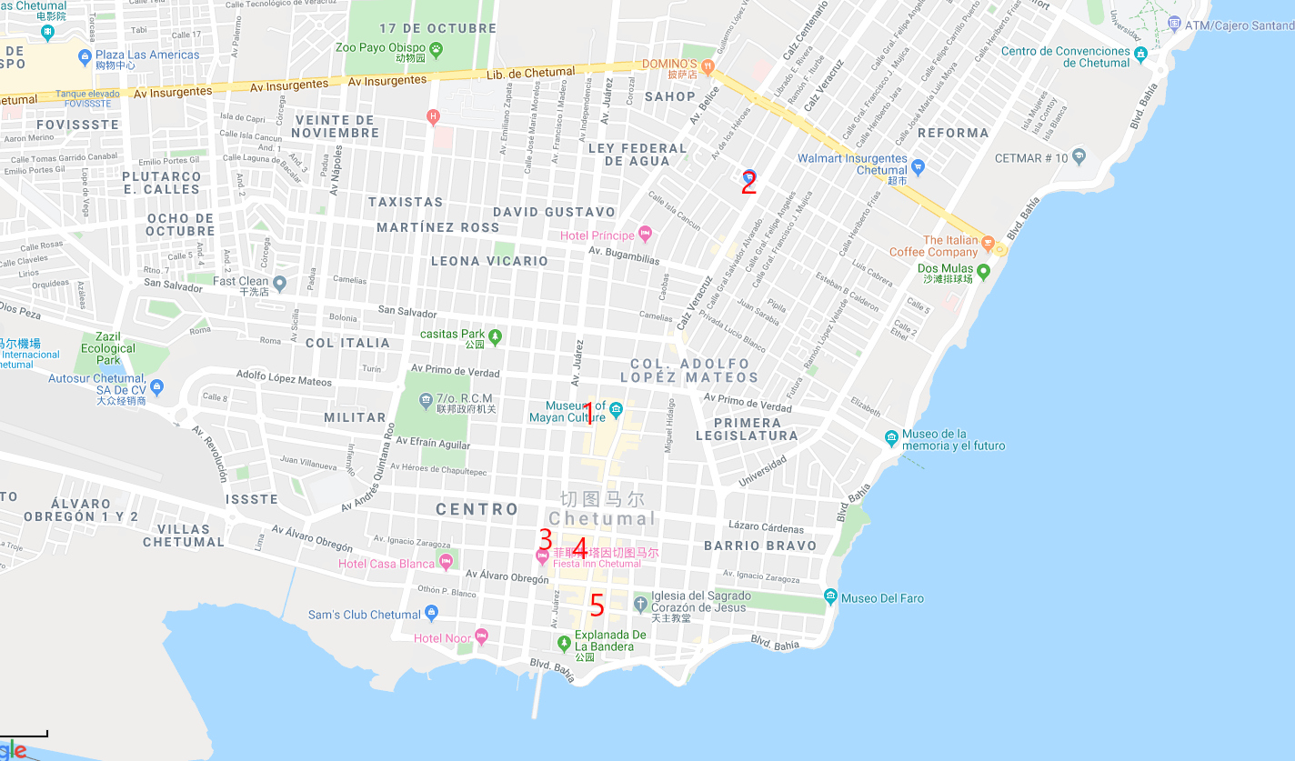 1 为ADO 在市中心的车站,对面就是Maya cultura博物馆(ADO在chetumal有两个停靠点,一个在市中心,就是此个。另外一个在市区中心的西北方向,距离市区中心2.5公里)