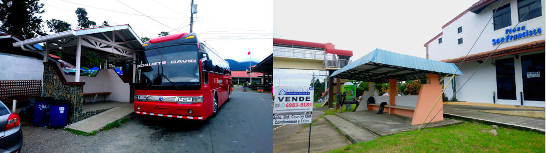 Bajo Boquete镇上,到david的大巴候车处(图左),及在Spanish by the river附近的公交车站(图右)