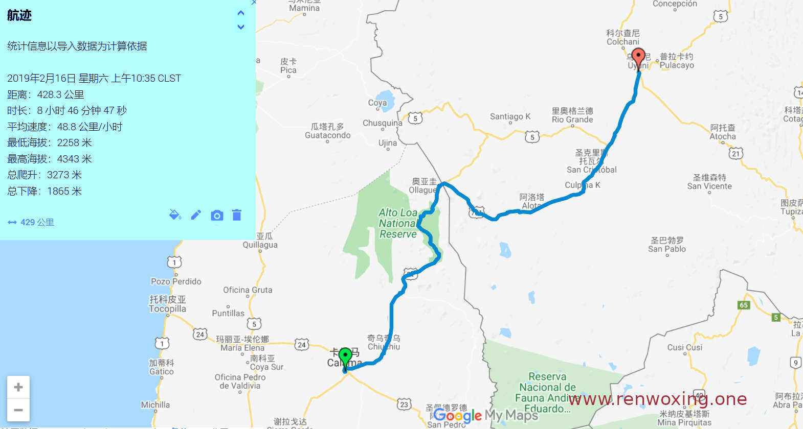 从智利的calama 出发,到玻利维亚的Uyuni,总行程429公里,耗时8小时46分钟,最高海拔4343米(在玻利维亚的Alota附近)。