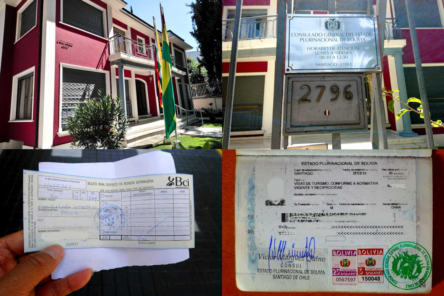 先在网站 ( www.consuladodebolivia.cl )上存资料,完毕后,把网上的表格下载下来,并打印出来。再拿着表格到使馆申请即可,费用30美金,到银行交款。6天后取证。