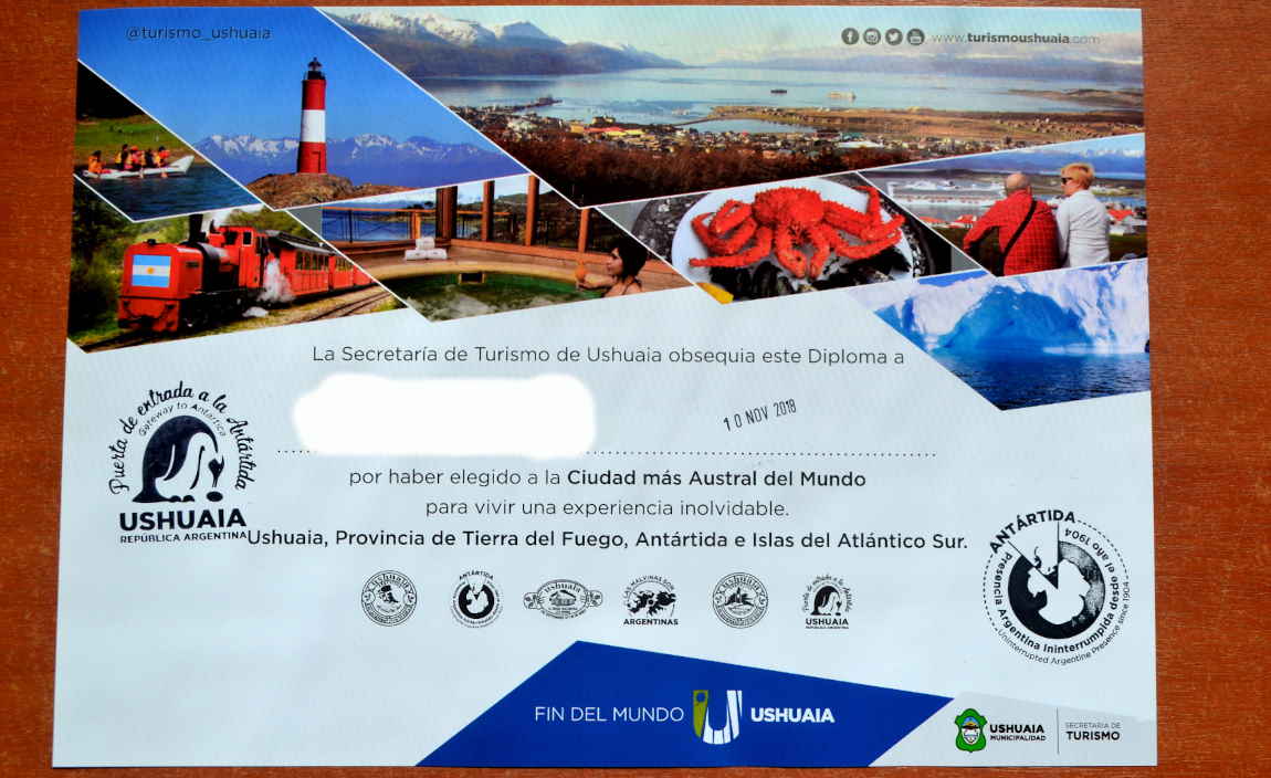在旅游办公室内,呈上护照,还给你颁发一张签有你名字的,到过ushuaia旅游的证书